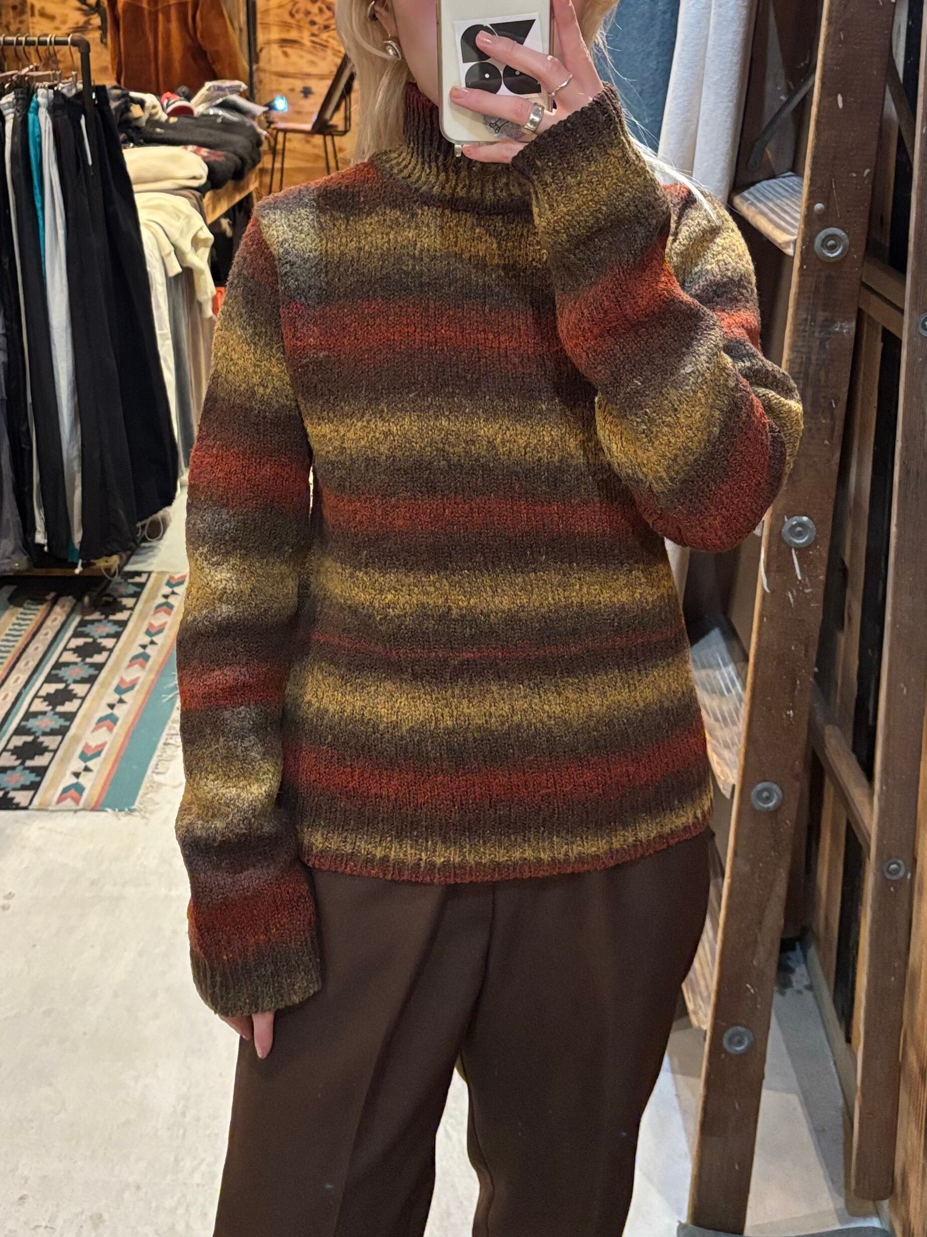 落ち着いた赤やオリーブ、ブラウンを重ねた、柔らかなグラデーションが魅力のモックネックニットです。