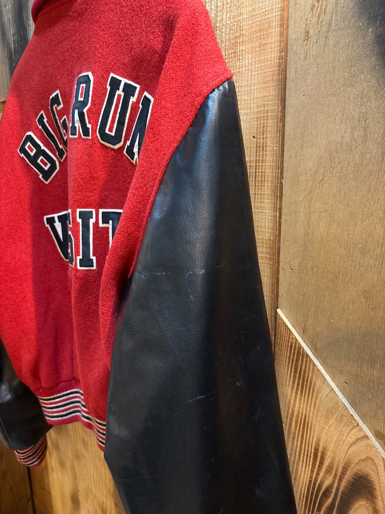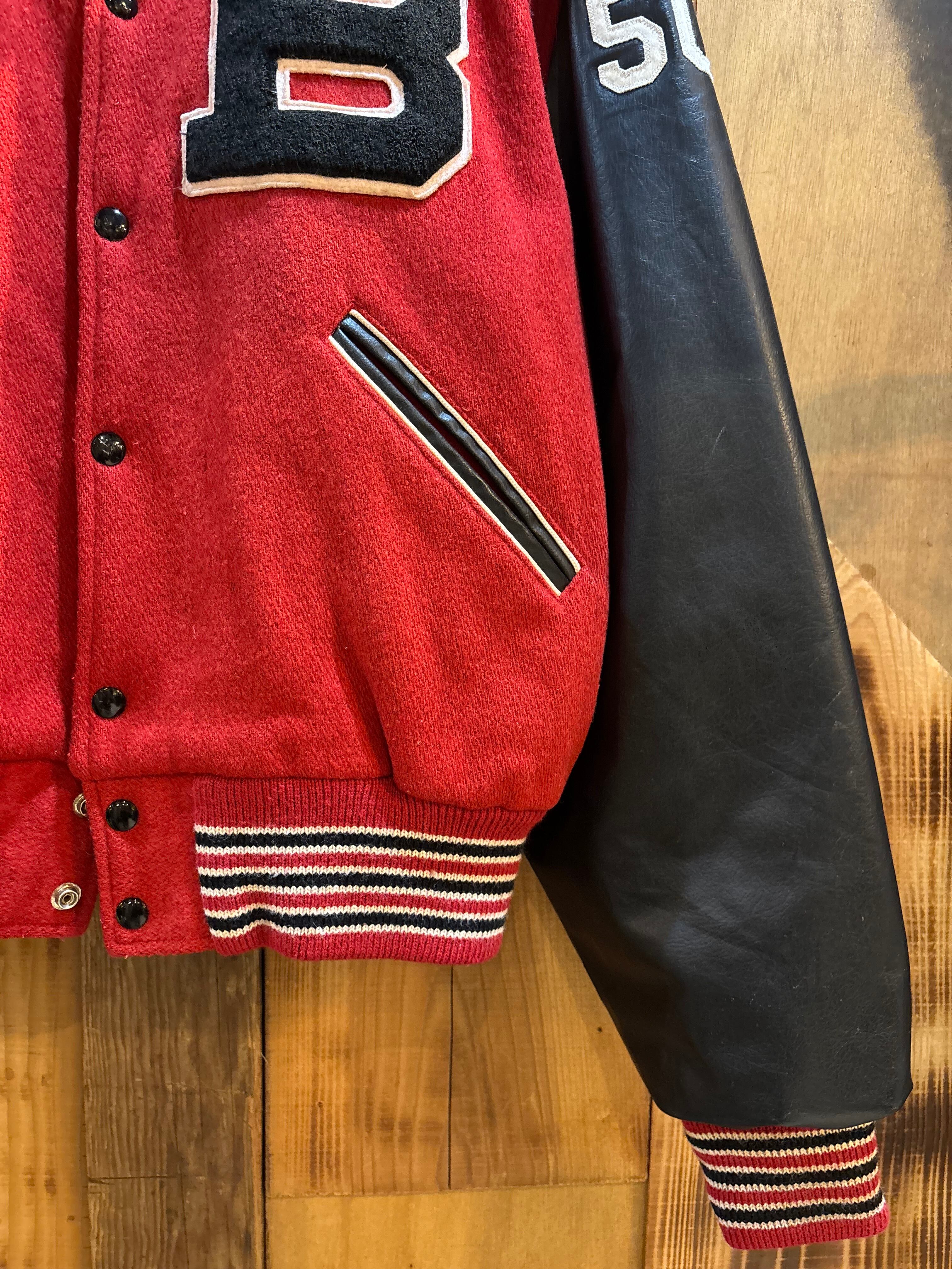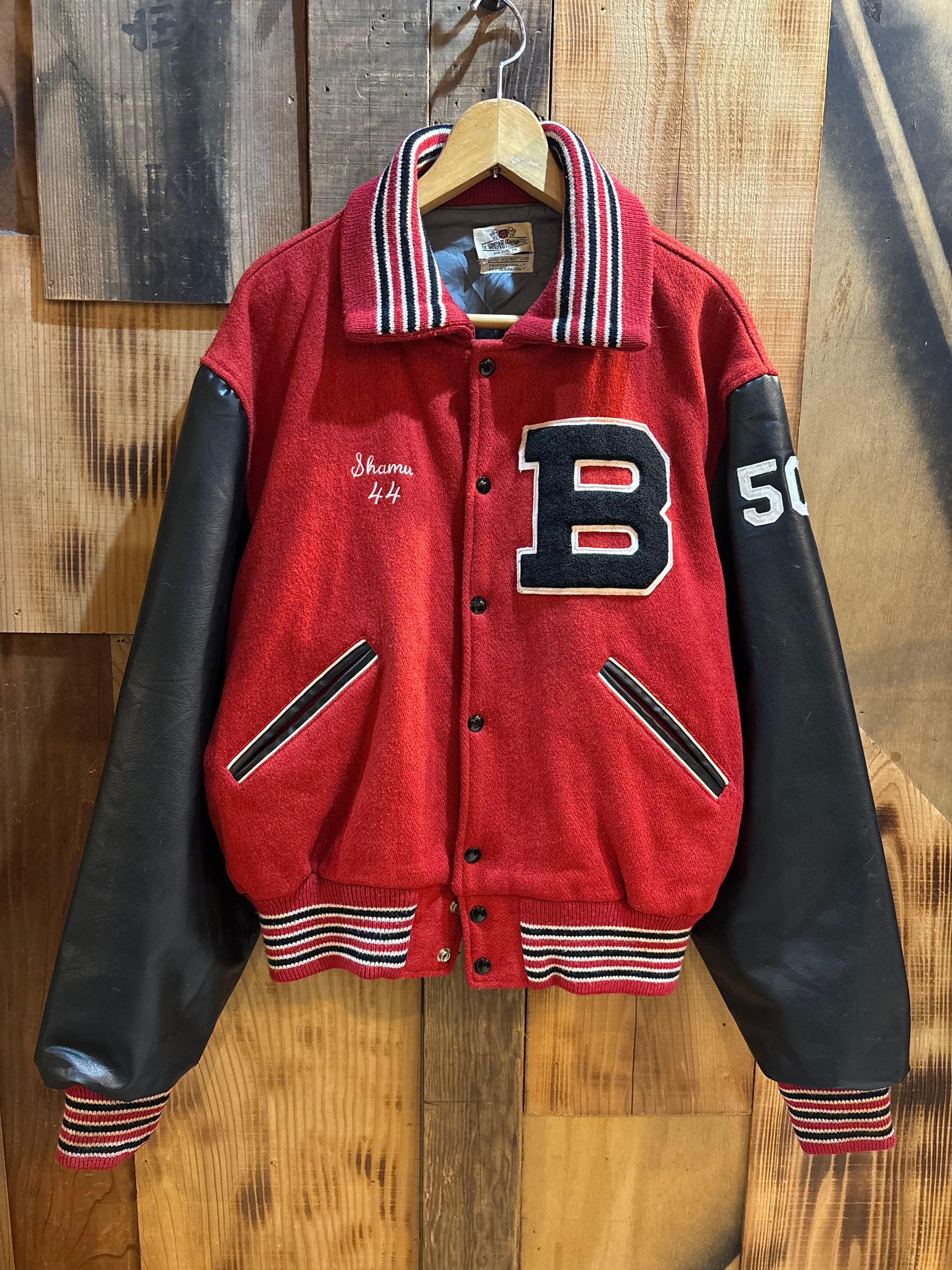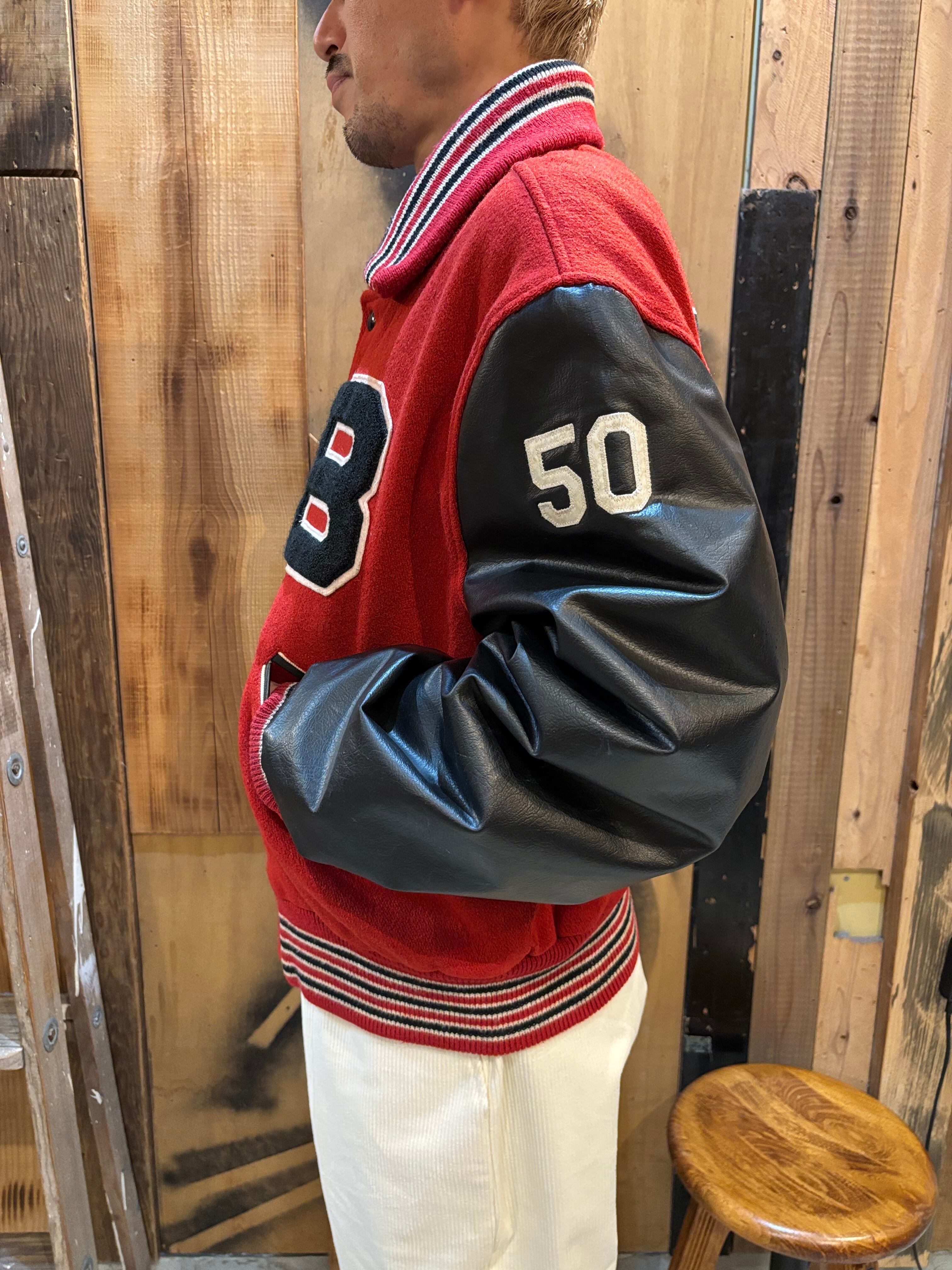 赤ボディ×ブラックレザー袖の、クラシックなアメリカン・バーシティジャケット。