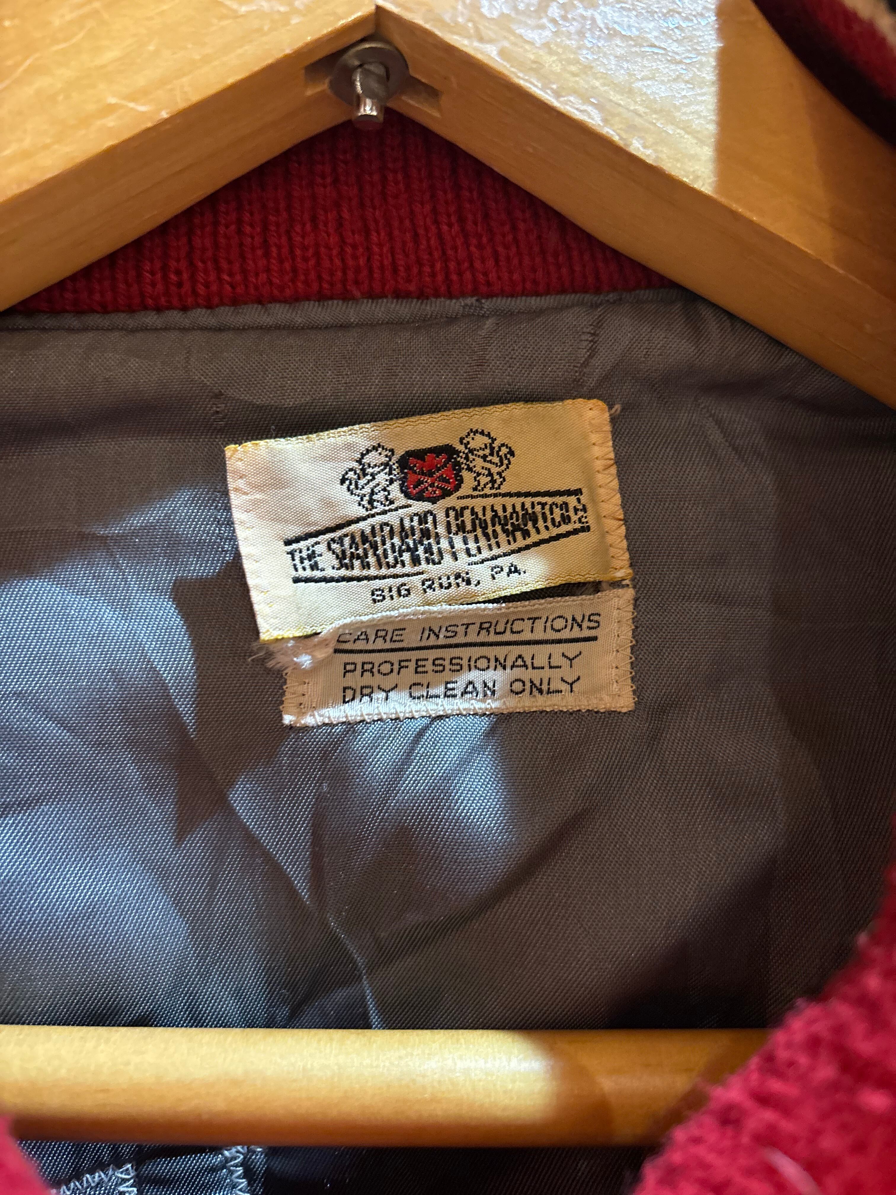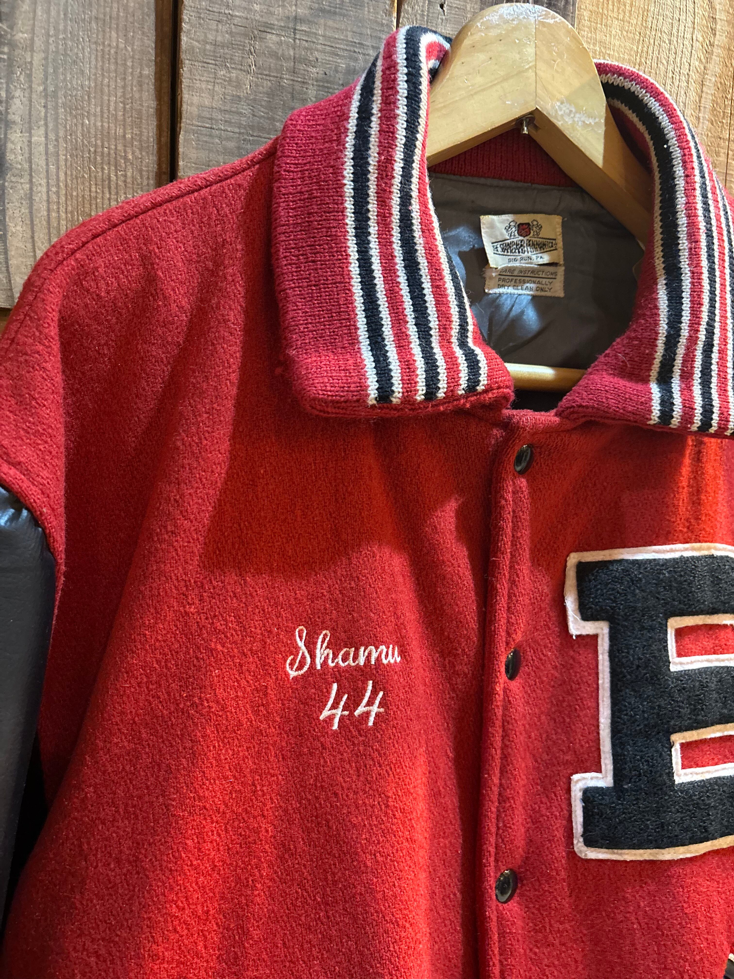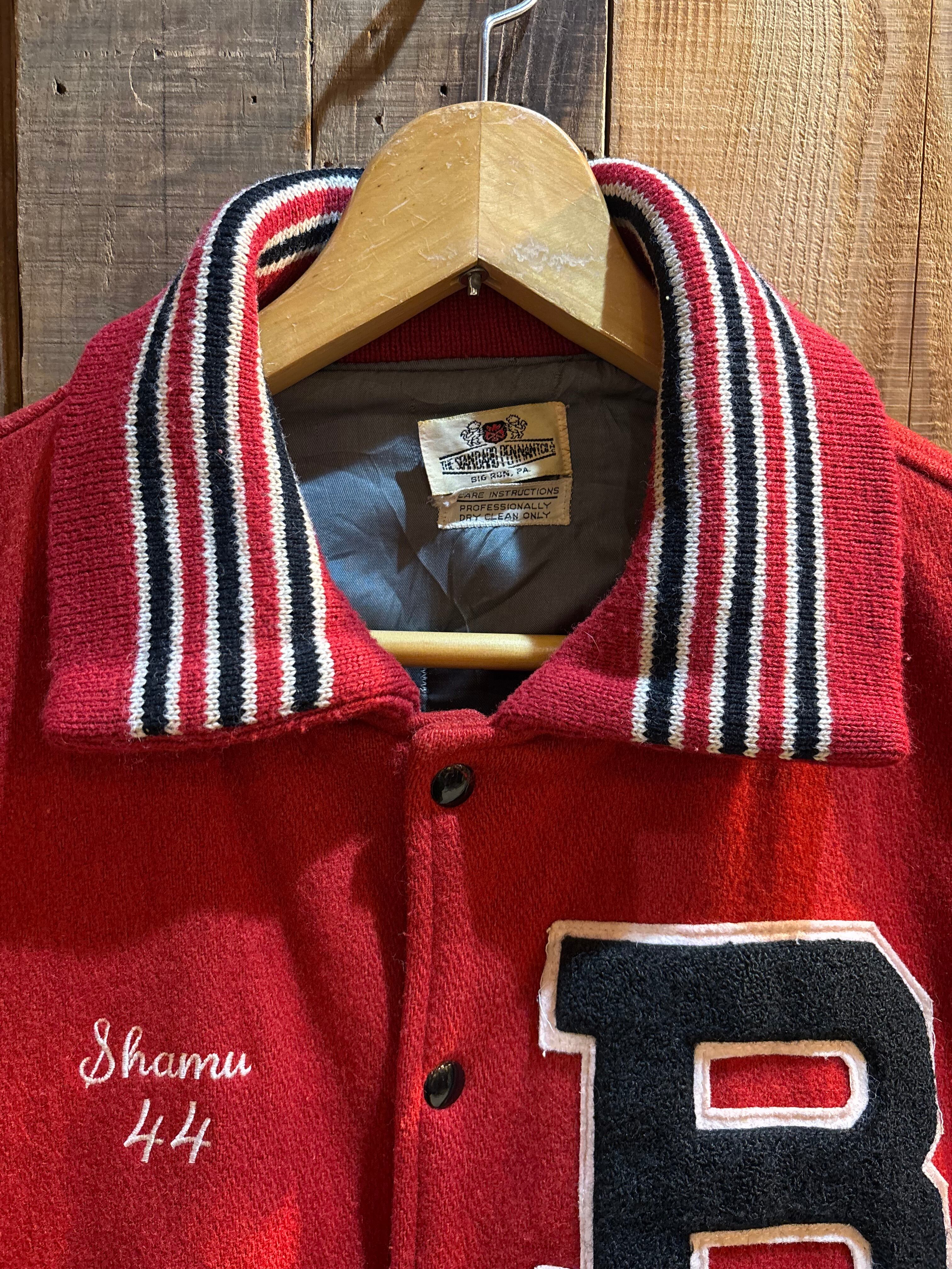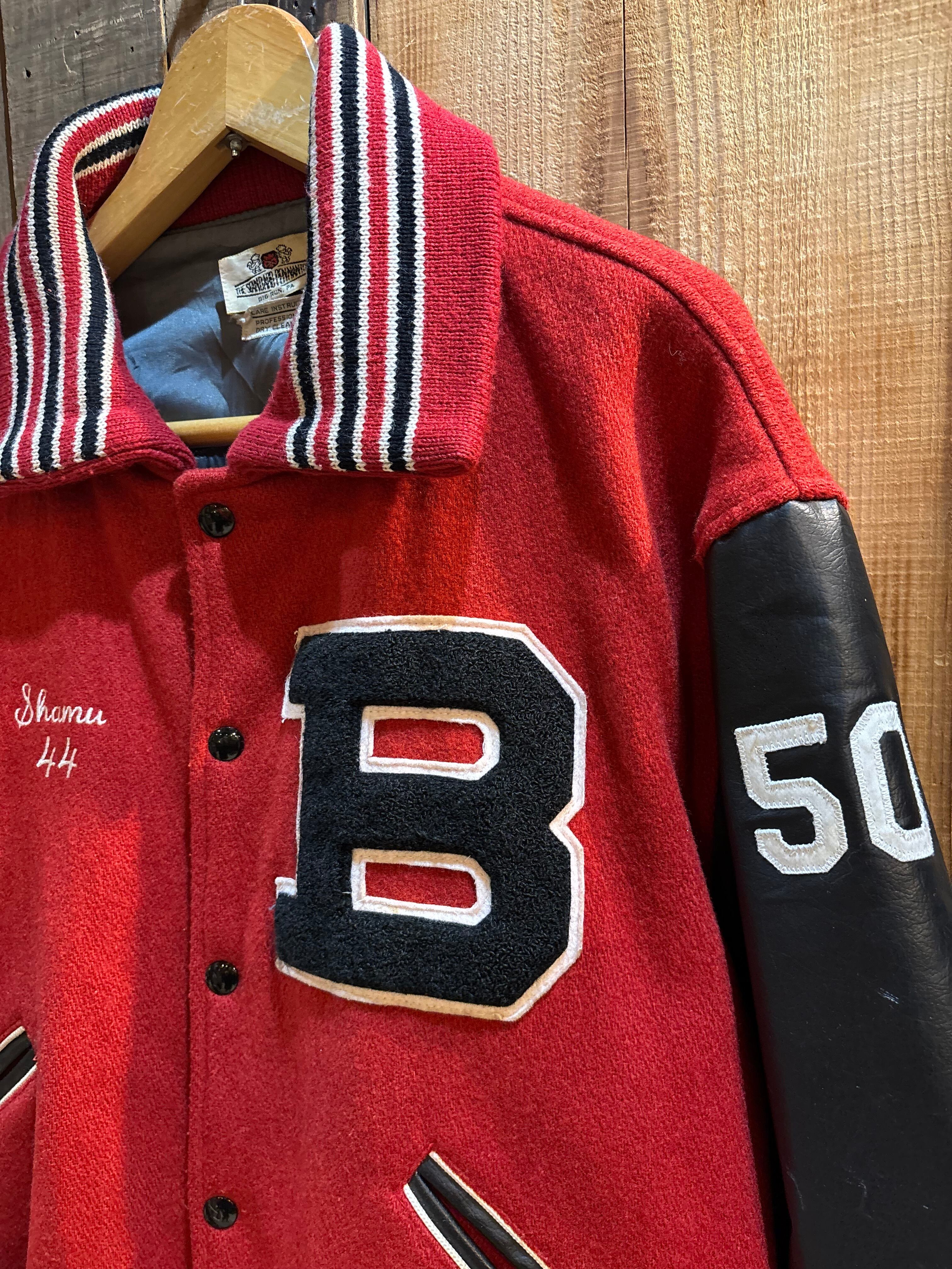赤ボディ×ブラックレザー袖の、クラシックなアメリカン・バーシティジャケット。