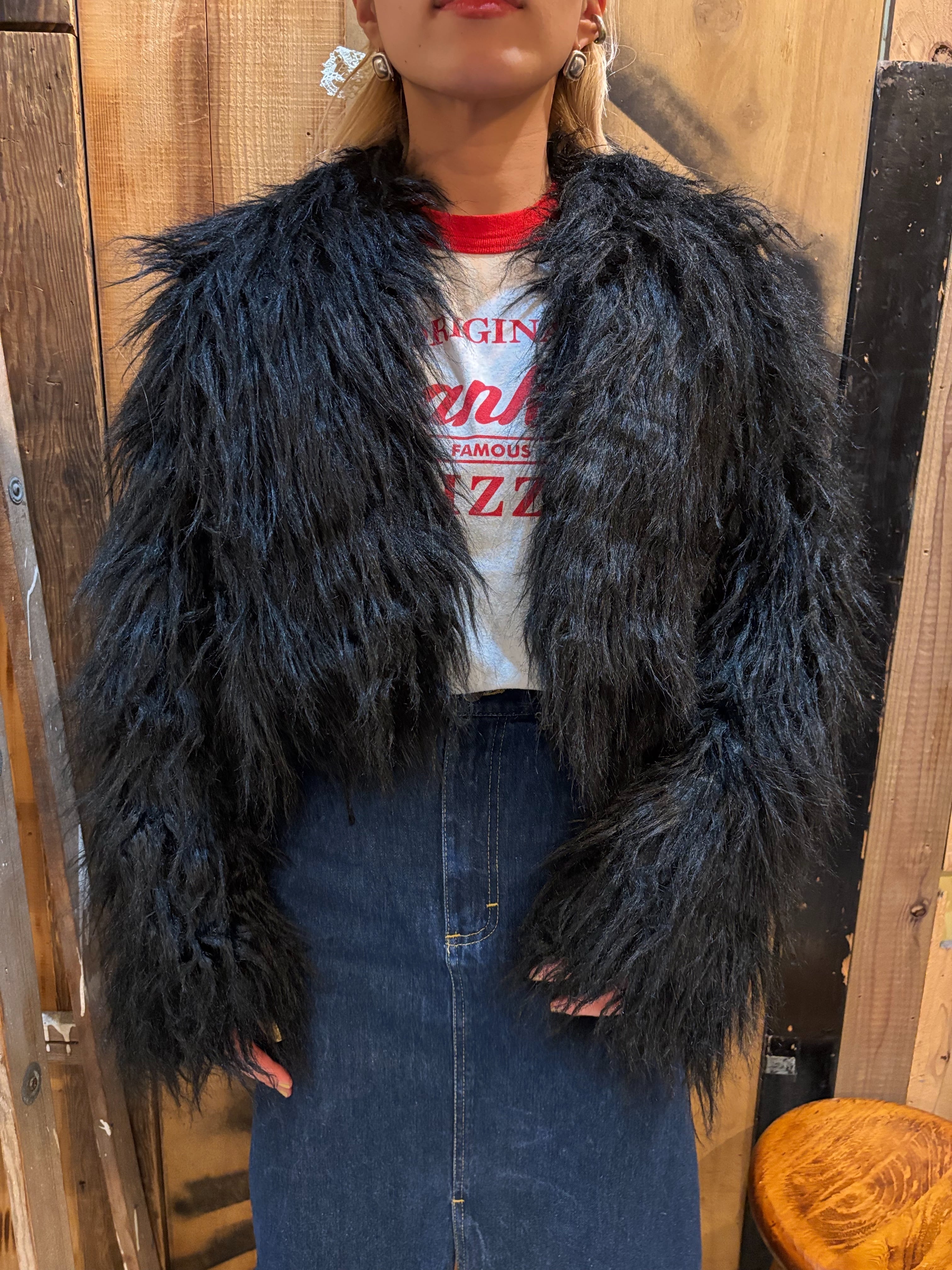 存在感たっぷりのもけもけショート丈ビーガンファージャケット。